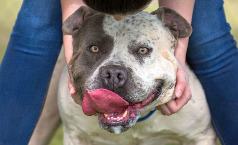 This tricolor treat of a dog is one big baby, as she often weighs north of 100 pounds. Her happy-go-lucky spirit is infectious, and those soul-filled eyes are too precious for words. She’s rare, too, so expect lots of compliments and questions when you two go out and about.